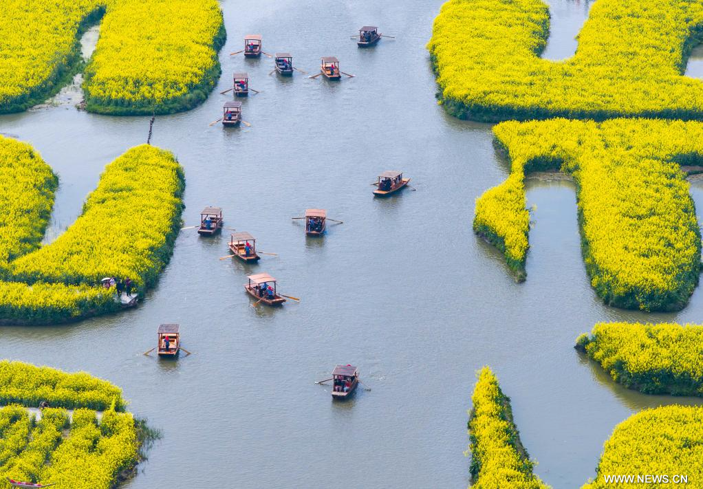 بكين 4 أبريل 2026 (شينخوا) في الصورة الملتقطة يوم 2 أبريل 2026، سياح يستمتعون بوقتهم في منطقة ذات مناظر خلابة بمدينة شينغهوا في مقاطعة جيانغسو بشرقي الصين.
