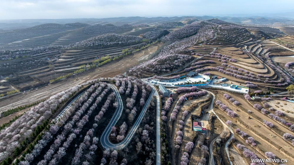 قويوان 6 أبريل 2026 (شينخوا) في الصورة الملتقطة يوم 5 أبريل 2026، مشهد للزهور في منتزه جينجيبينغ للحقول المدّرجة بمدينة قويوان في منطقة نينغشيا ذاتية الحكم لقومية هوي بشمال غربي الصين.