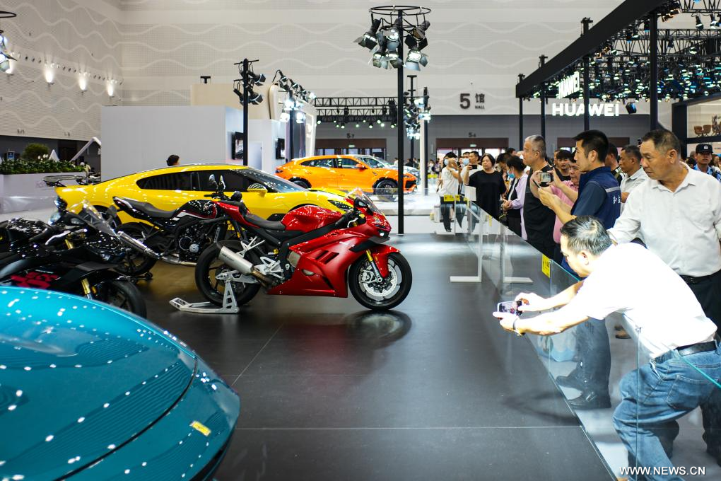 هايكو 18 أبريل 2026 (شينخوا) في الصورة الملتقطة يوم 17 أبريل 2026، زوار يلتقطون صورا للدراجات النارية "زد إكس موتو" المعروضة خلال الدورة السادسة من معرض الصين الدولي للمنتجات الاستهلاكية في مدينة هايكو حاضرة مقاطعة هاينان بجنوبي الصين.