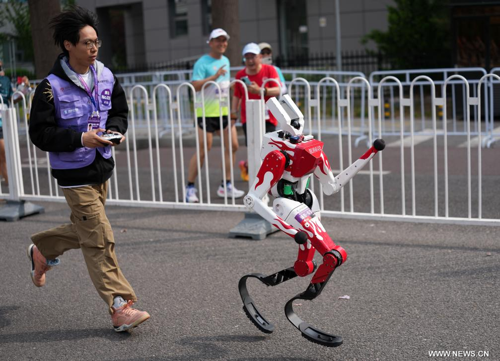 بكين 19 أبريل 2026 (شينخوا) في الصورة الملتقطة يوم 19 أبريل 2026، روبوت شبيه بالبشر يتم التحكم به عن بعد يركض خلال سباق نصف الماراثون للروبوتات الشبيهة بالبشر في العاصمة الصينية بكين.