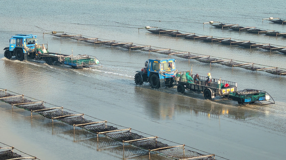 حصاد الطحالب البحرية في منطقة تربية الطحالب البحرية في البحر الأصفر