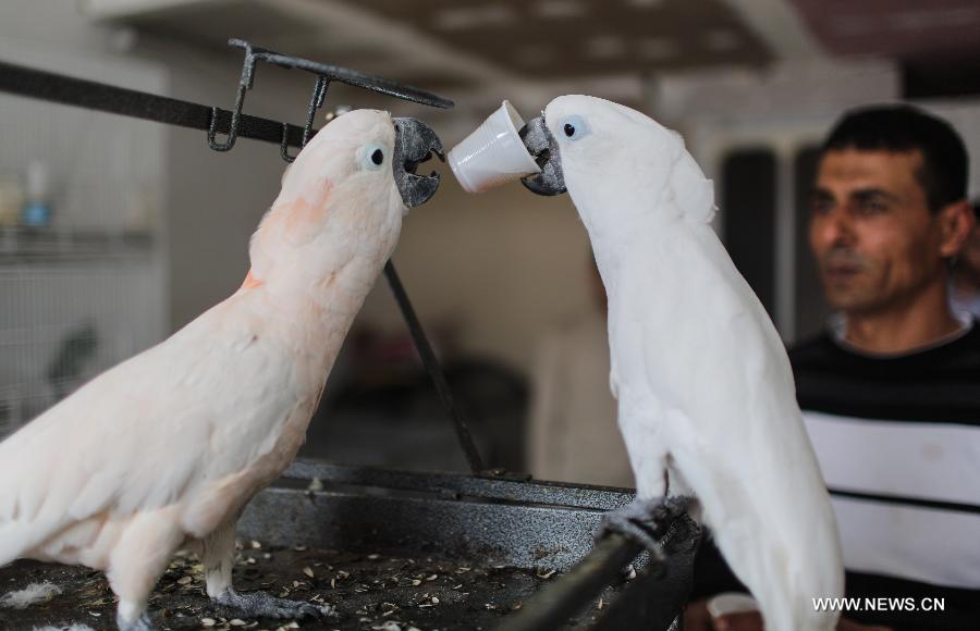 غزة 10 مارس 2015 (شينخوا) داخل متجر صغير لبيع الطيور في حي الشجاعية شرقي مدينة غزة يدمن طيرا ببغاء احتساء القهوة والشاي في حالة نادرة من نوعها.