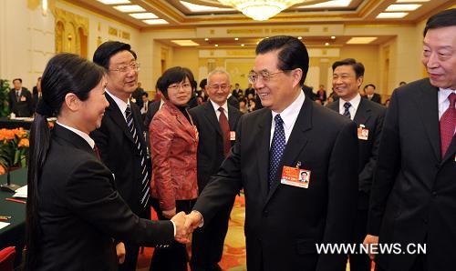 بكين 5 مارس 2011 (شينخوا) انضم الرئيس الصيني هو جين تاو وزعماء صينيون بارزون آخرون على التوالي إلى مناقشات اللجان مع مشرعين وطنيين فى الدورة البرلمانية السنوية اليوم (السبت) فى بكين.