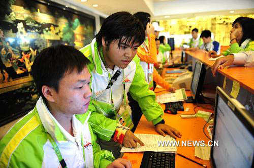قوانغتشو 12 نوفمبر 2010 (شينخوا) في الصورة الملتقطة يوم 12 نوفمبر 2010، يبدو يوان جون جيه (الثاني الى اليسار) المتطوع من جامعة هونغ كونغ وهو يسجل معلومات الضيوف الاجانب المشاركين في دورة ألعاب قوانغتشو الآسيوية في فندق بمدينة قوانغتشو المستضيفة للدورة.