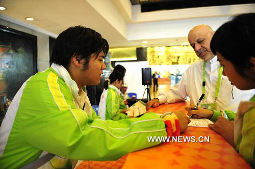 قوانغتشو 12 نوفمبر 2010 (شينخوا) في الصورة الملتقطة يوم 12 نوفمبر 2010، يبدو يوان جون جيه (الى اليسار) المتطوع من جامعة هونغ كونغ وهو يقدم خدمات لضيف اجنبي مشارك في دورة ألعاب قوانغتشو الآسيوية في فندق بمدينة قوانغتشو المستضيفة للدورة.