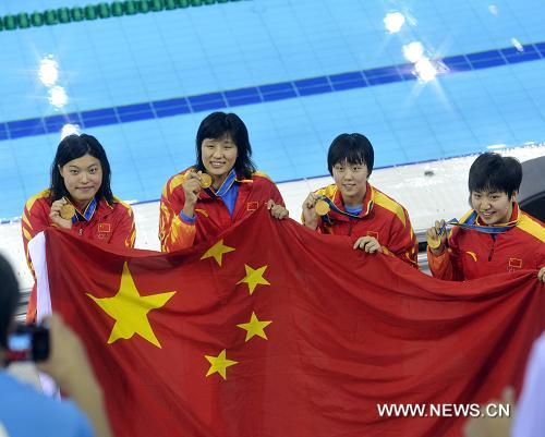 قوانغتشو 14 نوفمبر 2010 (شينخوا) فازت الصين المضيفة بالميدالية الذهبية في سباق التتابع الحر 100 متر سباحة سيدات في دورة الالعاب الآسيوية بقوانغتشو المقامة هنا اليوم (الأحد).