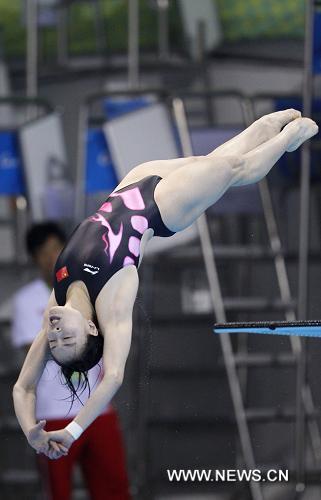 قوانغتشو 24 نوفمبر 2010 (شينخوا) في الصورة الملتقطة يوم 24 نوفمبر 2010، اللاعبة الصينية وو مين شيا أثناء نهائي مسابقة الغطس من السلم المتحرك 1 متر للسيدات في دورة قوانغتشو للالعاب الاسيوية. وفي اليوم نفسه فازت وو بذهبية المسابقة برصيد 326.15 نقطة.