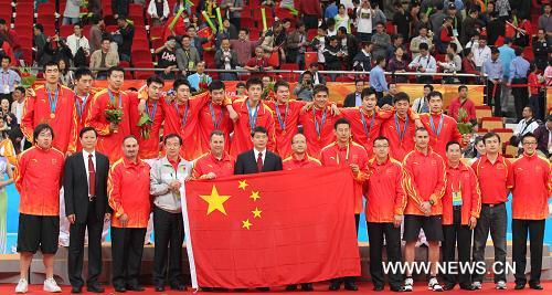 قوانغتشو 27 نوفمبر 2010 ( شينخوا) في الصورة الملتقطة يوم 26 نوفمبر 2010 ، لاعبو منتخب كرة السلة الصيني للرجال يقفون على منصة الشرف . وفي نفس اليوم ، فاز المنتخب الصيني لكرة السلة للرجال على نظيره الكوري الجنوبي 77 / 71 في الدورة النهائي لكرة السلة للرجال في الألعاب الآسيوية تقام في قوانغتشو حاضرة مقاطعة قوانغدونغ بجنوب الصين .