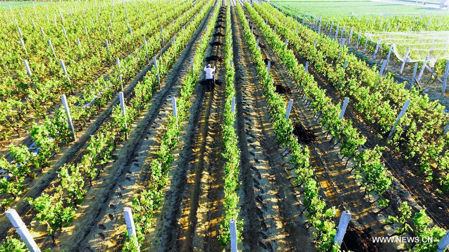 في الصورة الملتقطة يوم 3 مايو 2018، الفلاحون يعملون في مزرعة العنب في تسونهوا بمقاطعة خبي. في الوقت الحالي، ان عشرة آلاف مو من العنب في مقاطعة خبي تدخل في الفترة الحرجة للإدارة، فالفلاحون يقومون بالأعمال الزراعية مثل تقليم الفروع وتطبيق الأسمدة.