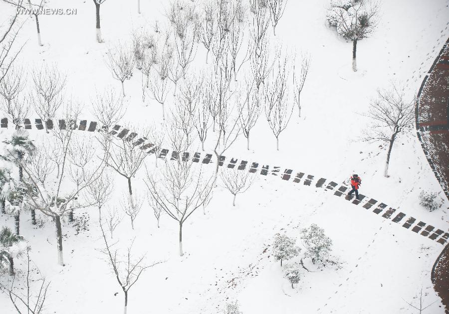 يمشي رجل في الثلج في الحديقة لمحافظة شويى التابعة لمدينة هوايان وسط مقاطعة جيانغسو جنوب شرقي الصين، 12 يناير، 2016. (شينخوا/ تشو هاي جيون)