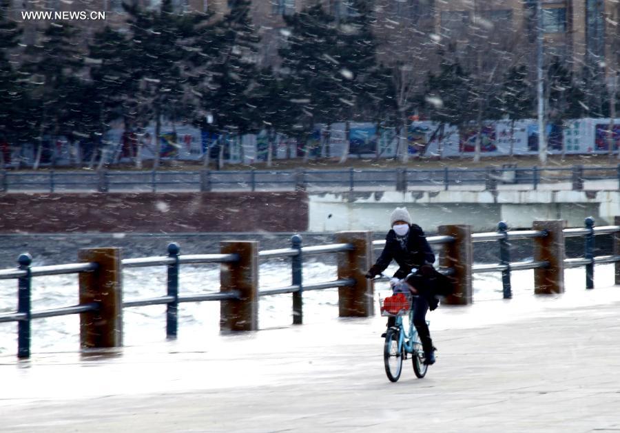 تركب امرأة الدراجة في الثلج على شاطئ البحر في مدينة ويهاى بمقاطعة شاندونغ شرق الصين، 12 يناير، 2016. (شينخوا / يوى تشي بوه)