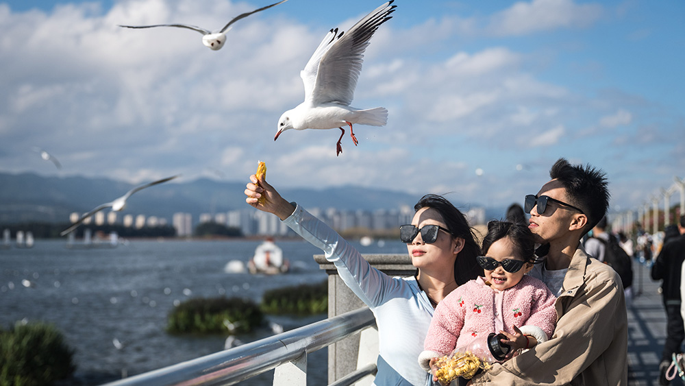 طيور النورس أحمر المنقار في بحيرة ديانتشي بجنوب غربي الصين