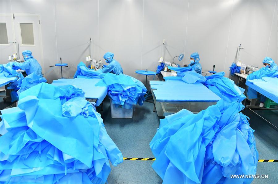 شينغيي، قويتشو 22 فبراير 2020 (شينخوا) في الصورة الملتقطة يوم 21 فبراير 2020، مشهد من ورشة عمل لشركة بمقاطعة قويتشو بجنوب غربي الصين تبذل قصارى جهودها لإنتاج منتجات الوقاية الطبية واللوازم الطبية من أجل ضمان الإمدادات في معركة الصين ضد وباء فيروس كورونا الجديد.