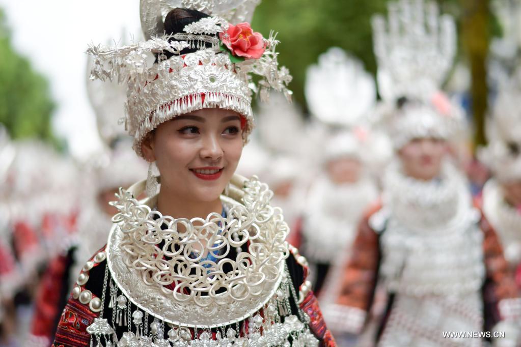 تايجيانغ 27 أبريل 2021 (شينخوا) في الصورة الملتقطة يوم 25 أبريل 2020 فتاة من قومية مياو تشارك في مسيرة احتفالية بمهرجان الأخوات للقومية في محافظة تايجيانغ في ولاية تشياندونغنان ذاتية الحكم لقوميتي مياو و دونغ في مقاطعة قويتشو بجنوب غربي الصين.