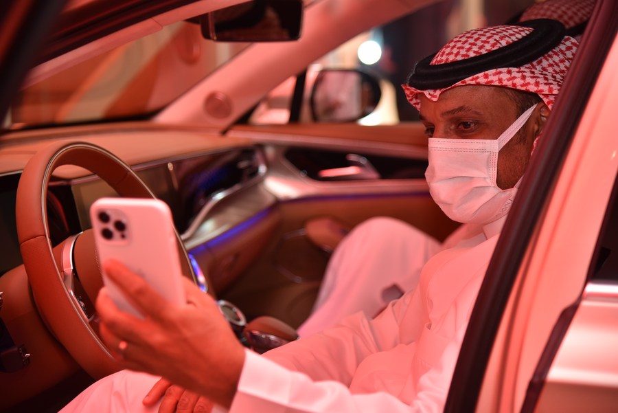 في الصورة عميل سعودي يجرب سيارة سيدان من طراز (هونغ تشي إيتش9). (شينخوا)
