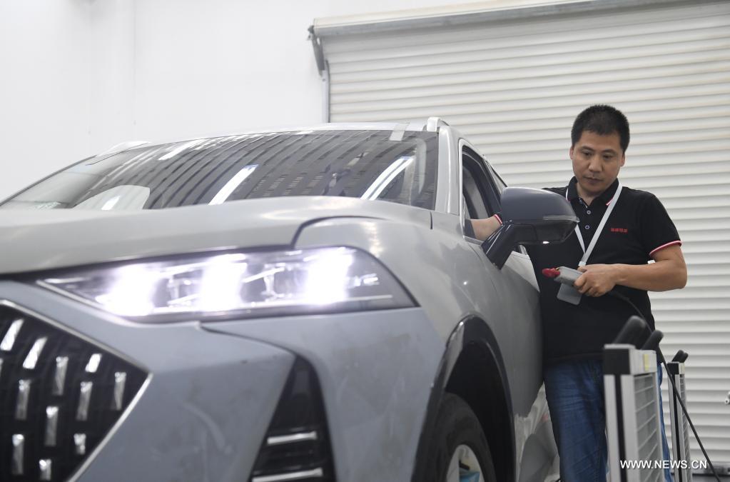 باودينغ 19 يوليو 2021 (شينخوا) في الصورة الملتقطة يوم 15 يوليو 2021، فني يجري اختبار أداء لمركبة تعمل بخلايا وقود الهيدروجين في مركز تكنولوجيا طاقة الهيدروجين لشركة جريت وول موتور في مدينة باودينغ بمقاطعة خبي شمالي الصين.