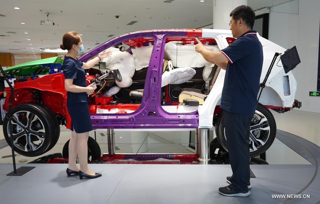 باودينغ 19 يوليو 2021 (شينخوا) في الصورة الملتقطة يوم 15 يوليو 2021، موظفة تقدم تعريفا لنظام الأمان لسيارة بمركز تكنولوجيا هافال لشركة جريت وول موتور في مدينة باودينغ بمقاطعة خبي شمالي الصين.