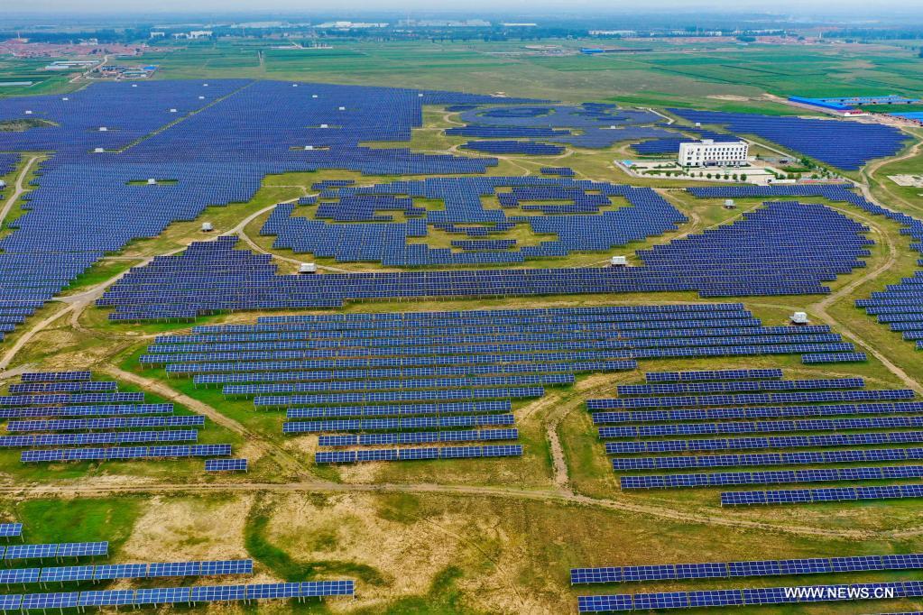 داتونغ 5 أغسطس 2021 (شينخوا) في الصورة الملتقطة يوم 3 أغسطس 2021، مشهد جوي لمحطة طاقة كهروضوئية على شكل باندا عملاقة، تقع في قرية توجينغ بمدينة داتونغ في مقاطعة شانشي شمالي الصين.