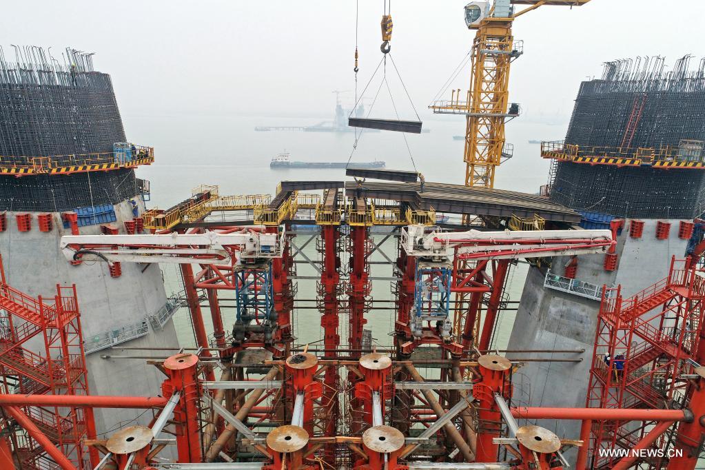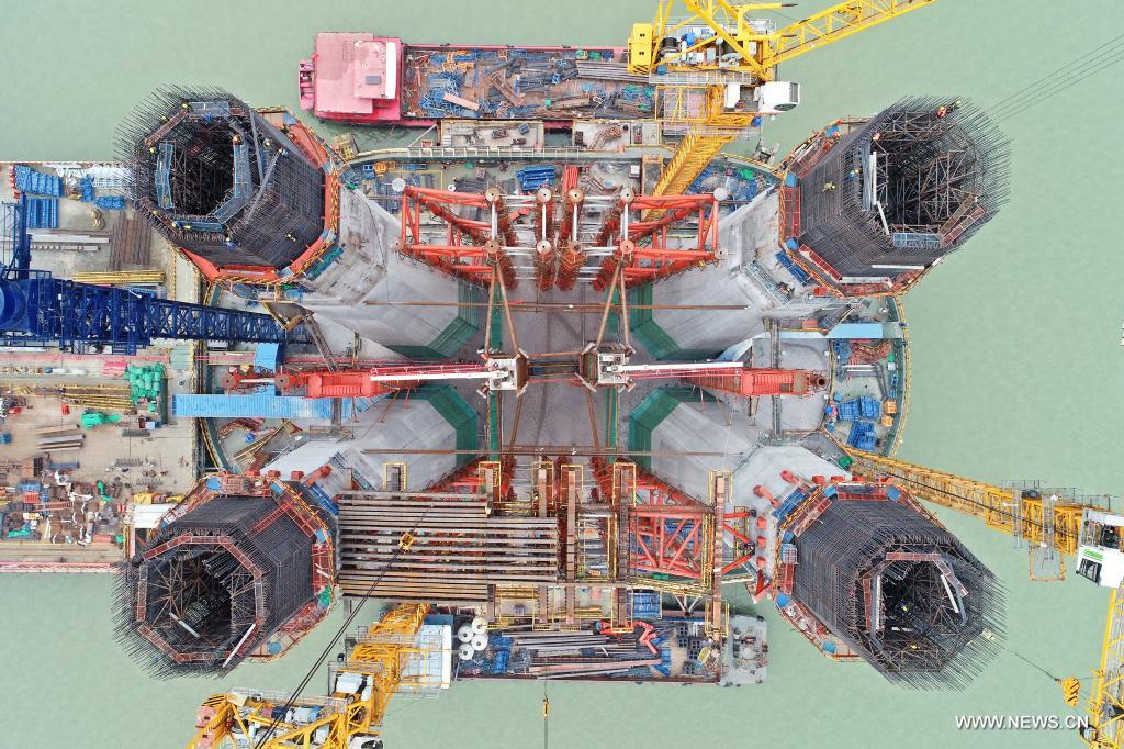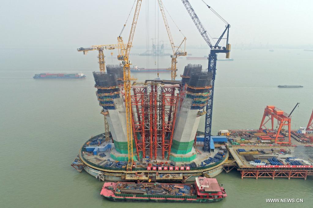 تشانغتشو 14 ديسمبر 2021 (شينخوا) في الصورة الملتقطة جوا يوم 11 ديسمبر 2021، موقع تشييد البرج الرئيسي رقم 6 لجسر تشانغتاي عبر نهر اليانغتسي. وسيدخل بناء البرج الرئيسي في مرحلة تشييد العارضة الأفقية بعد تشييد الركائز الدنيا.