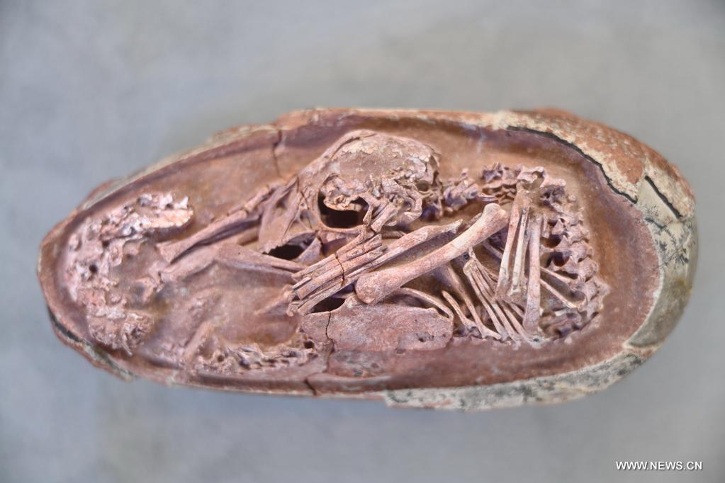 فوتشو 23 ديسمبر 2021 (شينخوا) في الصورة الملتقطة يوم 22 ديسمبر 2021، مشهد لجنين في بيضة ديناصور متحجرة في متحف بمقاطعة فوجيان بجنوب شرقي الصين.