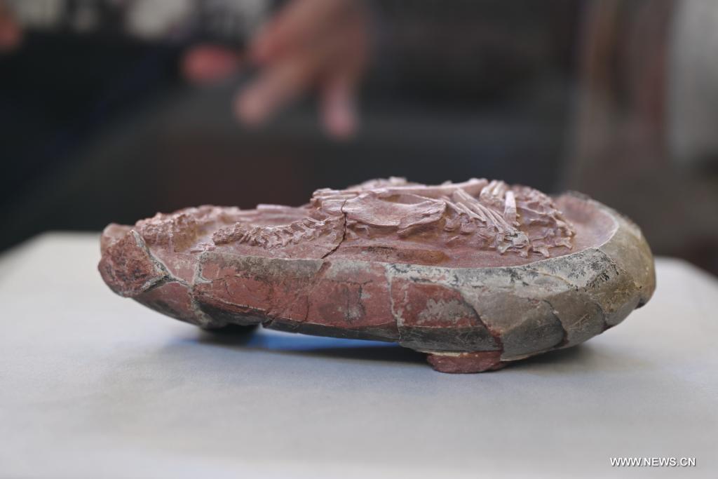 فوتشو 23 ديسمبر 2021 (شينخوا) في الصورة الملتقطة يوم 22 ديسمبر 2021، مشهد لجنين في بيضة ديناصور متحجرة في متحف بمقاطعة فوجيان بجنوب شرقي الصين.