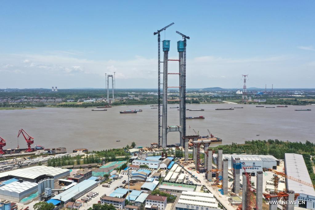 نانجينغ 11 يونيو 2022 (شينخوا) في الصورة الملتقطة يوم 10 يونيو 2022، جسر لونغتان على نهر اليانغتسي الذي يجري بناؤه بوتيرة متسارعة. ويربط الجسر بين مدينة يانغتشو شمالاً، ومدينة نانجينغ ومدينة جيويرونغ جنوباً في داخل مقاطعة جيانغسو، ولديه ستة خطوط باتجاهين للمركبات، ويبلغ طوله الإجمالي 4925 متراً، ويُتوقع أن يتم بناء الجسر في نهاية عام 2024.