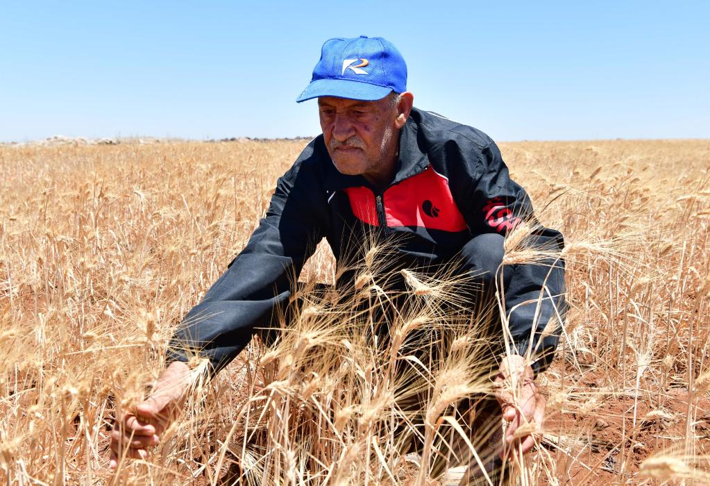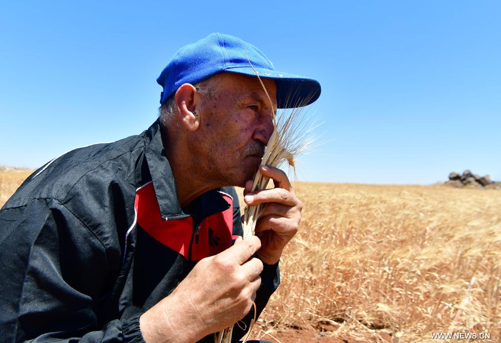 السويداء ـ سوريا 17 يوليو 2022 (شينخوا) مع بزوغ خيوط الشمس يقف المزارع السوري نايف صيموعة الرجل الخمسيني بالعمر، بوسط أرضه التي زرعها بالقمح، وراح يجني سنابل القمح التي انتظرها أكثر من أربعة أشهر لتنضج، ويتأملها بفرح شديد بعد أن أصبحت صفراء بلون الذهب، ويقبلها قائلا ،"الحمد الله على ما أعطيت من زرق"، و"رزق المقسوم وصل"، في دلالة على رضا ما انتجته الأرض من موسم وفير من القمح.