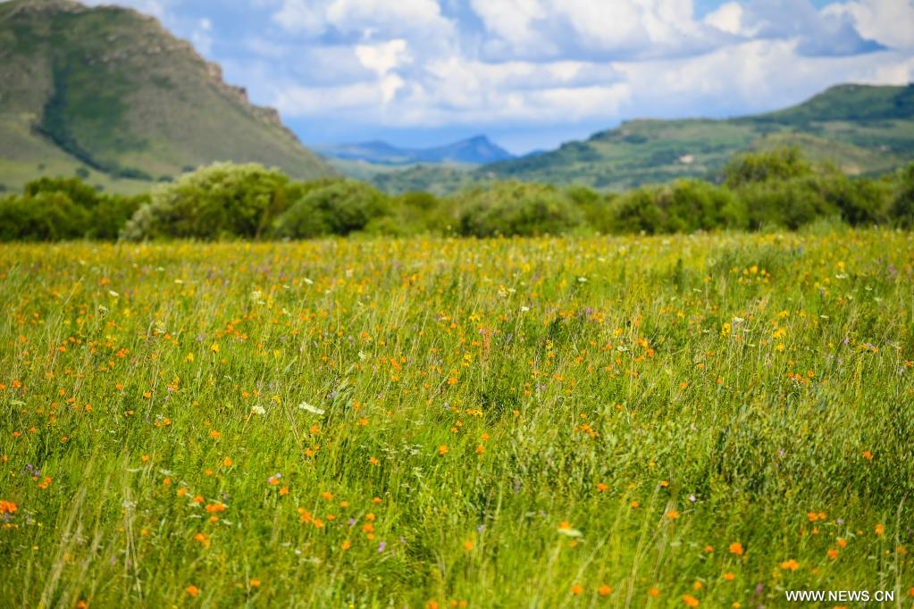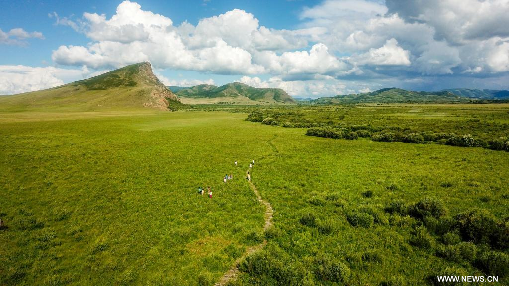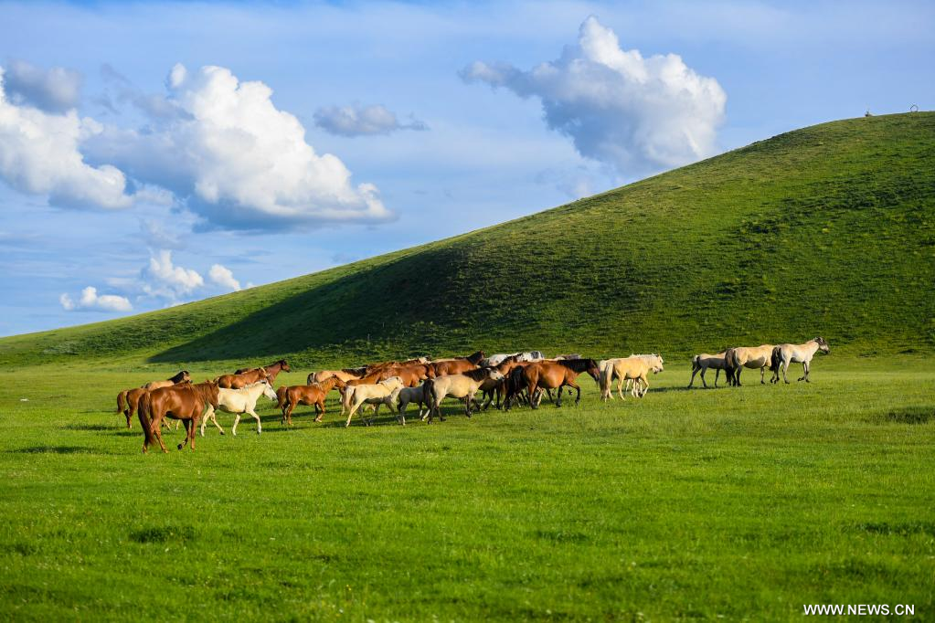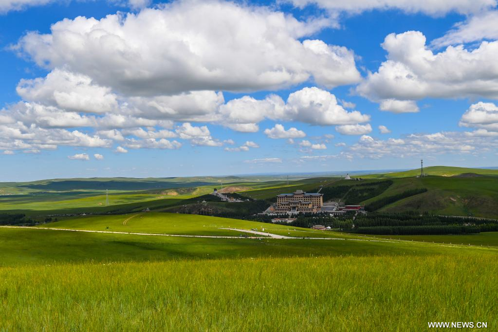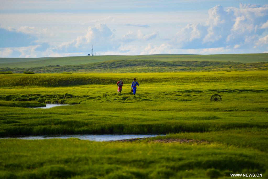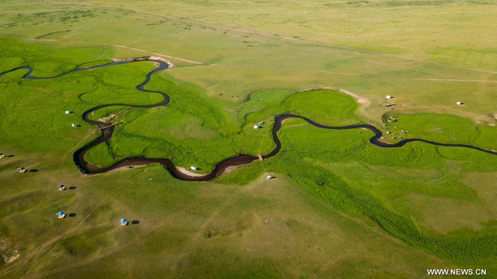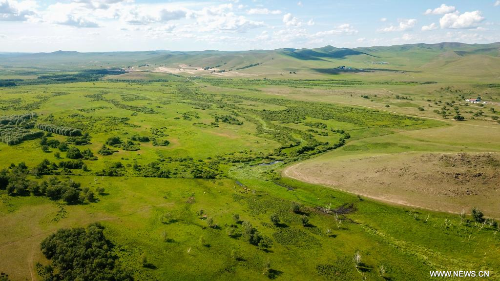 شيلين جول، منغوليا الداخلية 20 يوليو 2022 (شينخوا) في الصورة الملتقطة يوم 19 يوليو 2022، منظر للمروج في شيلين جول بمنطقة منغوليا الداخلية ذاتية الحكم شمالي الصين، حيث تكتسي المراعي حُلة خضراء في فصل الصيف لتشكل لوحة طبيعية خلابة.