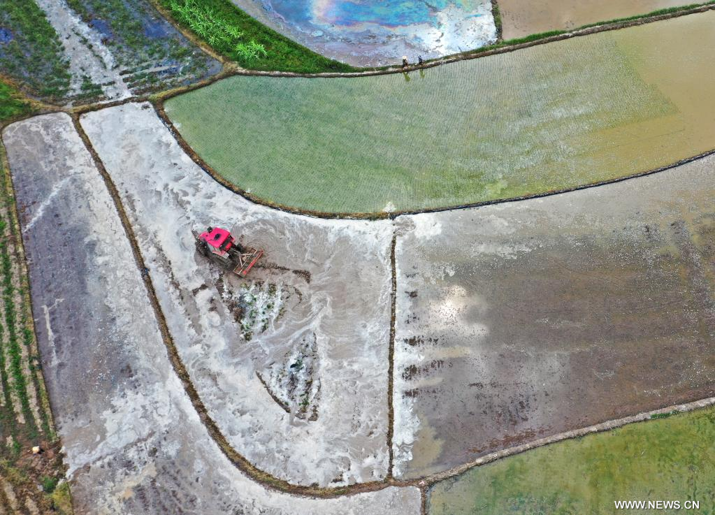 ناننينغ 3 أغسطس 2022 (شينخوا) في الصورة الملتقطة يوم 2 أغسطس 2022، منظر جوي لأعمال الزراعة المشغولة في حقل زراعي بمدينة ناننينغ حاضرة منطقة قوانغشي الذاتية الحكم لقومية تشوانغ في جنوبي الصين، حيث ينشغل المزارعون المحليون بزراعة الأرز مع حلول الموسم المواتي للزراعة.