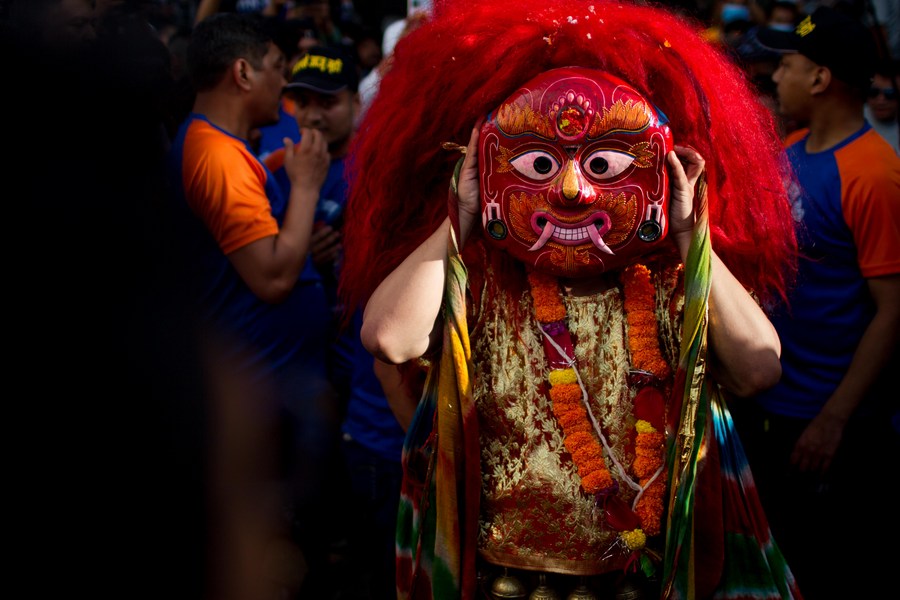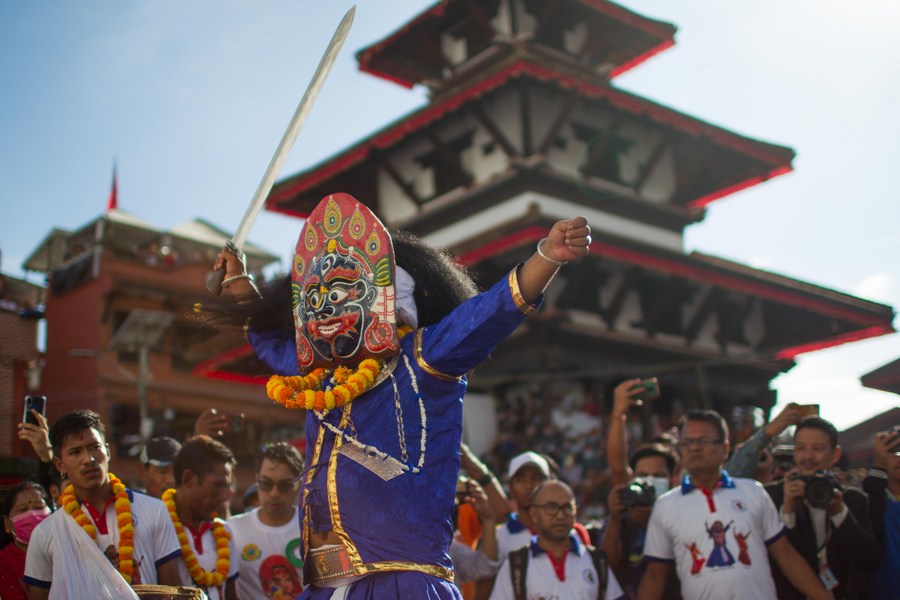 راقصة ترتدي قناعا تؤدي رقصة تقليدية خلال مهرجان إندرا جاترا في كاتماندو في نيبال يوم 9 سبتمبر 2022. (شينخوا)■