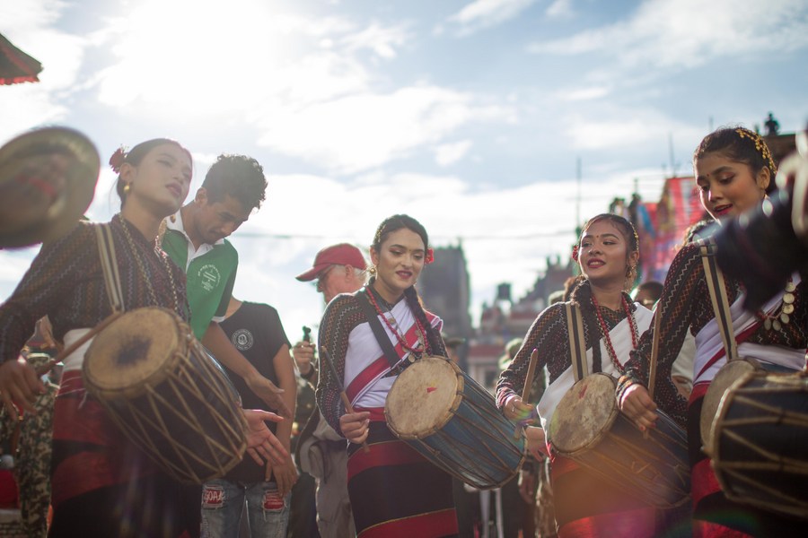فتيات نيباليات يقرعن الطبول خلال مهرجان إندرا جاترا في كاتماندو في نيبال يوم 9 سبتمبر 2022. (شينخوا)