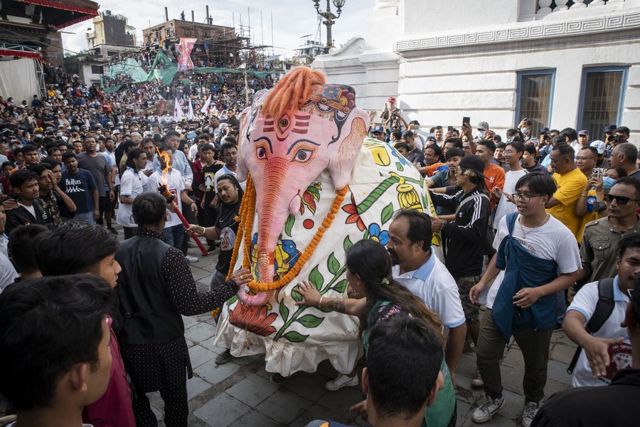 أداء رقصة الفيل التقليدية خلال مهرجان إندرا جاترا في كاتماندو في نيبال يوم 9 سبتمبر 2022. (شينخوا)