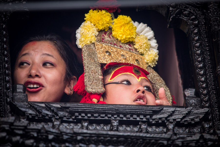 "الكوماري براثا" بايراب تنظر من نافذة خلال مهرجان إندرا جاترا في كاتماندو في نيبال يوم 9 سبتمبر 2022. (شينخوا)