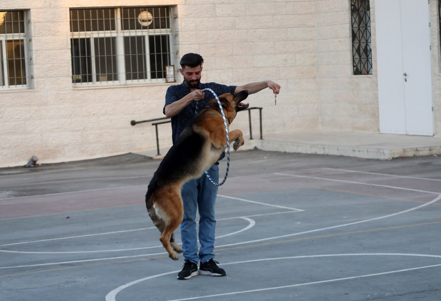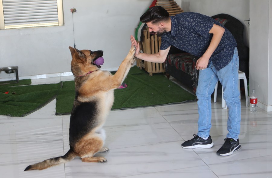 في الصورة الملتقطة يوم 22 أغسطس 2022، الفلسطيني منذر الجعبري يلعب مع كلبته الجيرمن "لوسي" في مدينة الخليل بالضفة الغربية. (شينخوا)