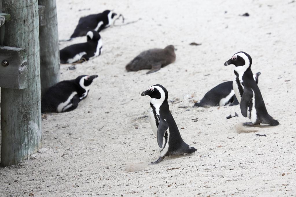 مجموعة من طيور البطريق الأفريقية تسير على الشاطئ في مستعمرة بولدرز للبطاريق، بلدة سيمون، الجزء الجنوبي الغربي من جنوب أفريقيا، 25 أبريل 2021. (شينخوا)