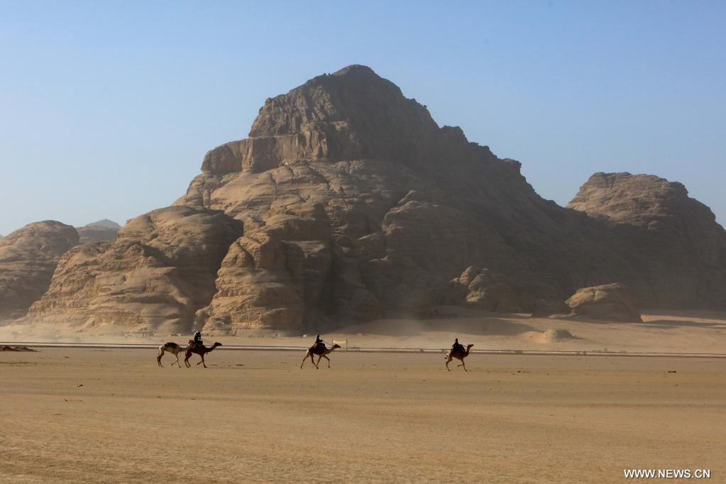 عمان أول أكتوبر 2022 (شينخوا) في الصورة الملتقطة يوم 30 سبتمبر 2022، مدربو جمال في صحراء وادي رم بالأردن ضمن فعاليات مهرجان الأردن لسباقات الهجن. انطلقت فعاليات المهرجان أمس الجمعة في صحراء وادي رم بالأردن بمشاركة أكثر من 500 جمل في السباق.