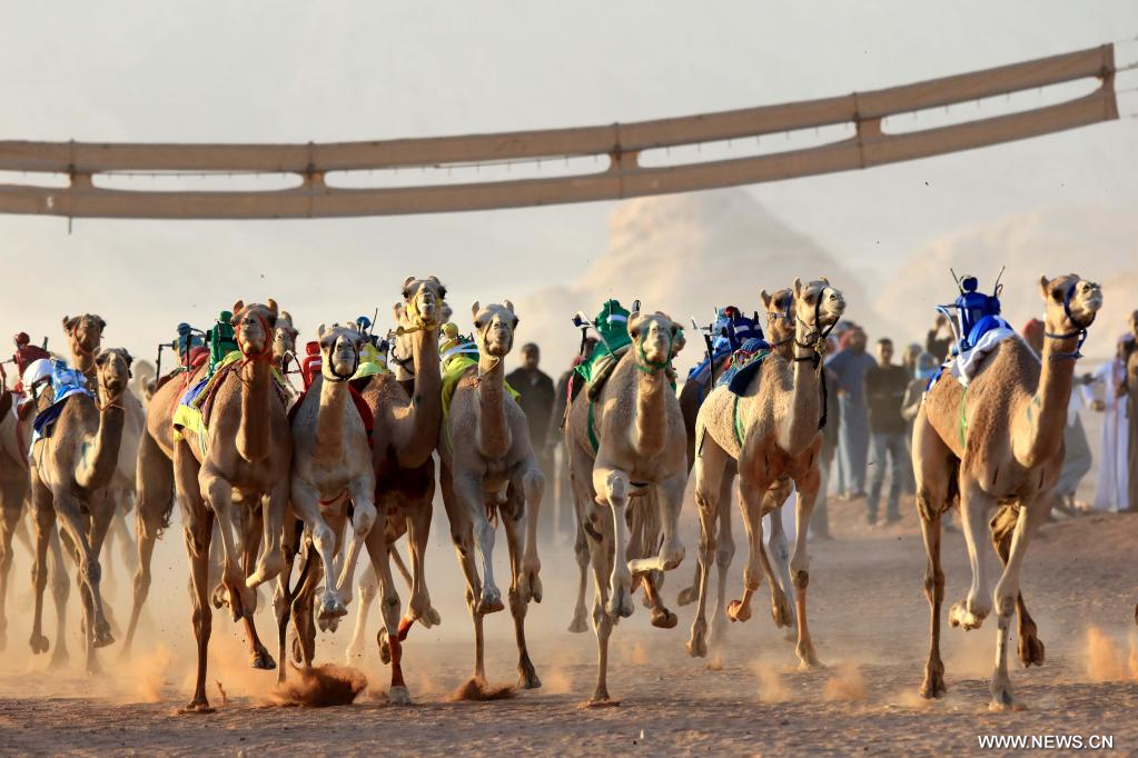 عمان أول أكتوبر 2022 (شينخوا) في الصورة الملتقطة يوم 30 سبتمبر 2022، جمال تتسابق خلال مهرجان الأردن لسباقات الهجن في صحراء وادي رم. انطلقت فعاليات المهرجان أمس الجمعة في صحراء وادي رم بالأردن بمشاركة أكثر من 500 جمل في السباق.