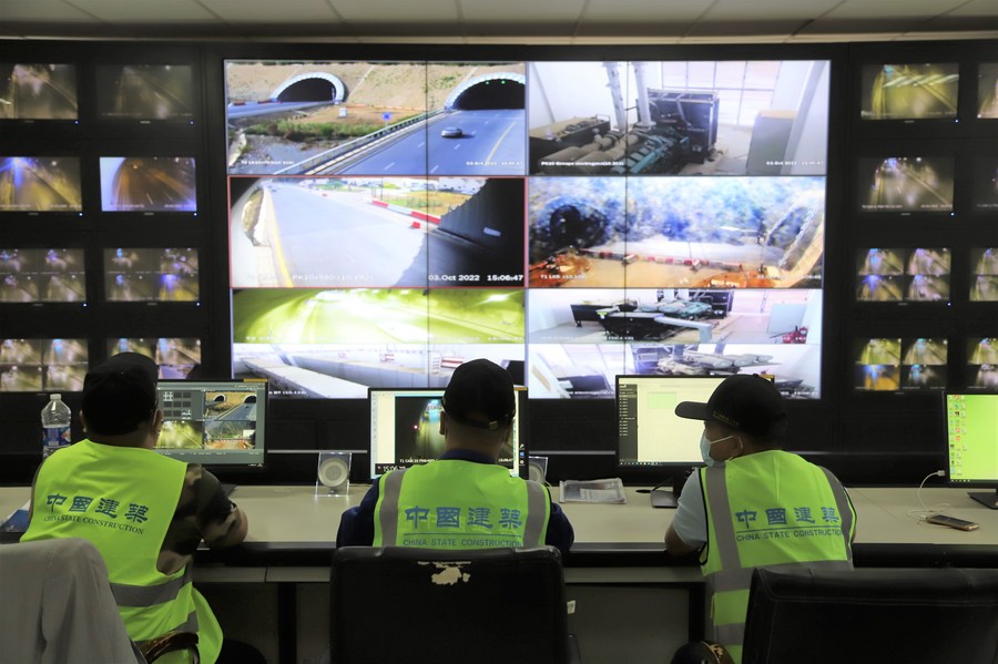 في ولاية المدية بالجزائر، مهندسون من الشركة الصينية العامة للهندسة المعمارية (CSCEC) يعملون في غرفة مراقبة النفق في المقطع الواقع بمنطقة الشفة من الطريق السيار شمال - جنوب في الجزائر، 3 أكتوبر 2022. (شينخوا)
