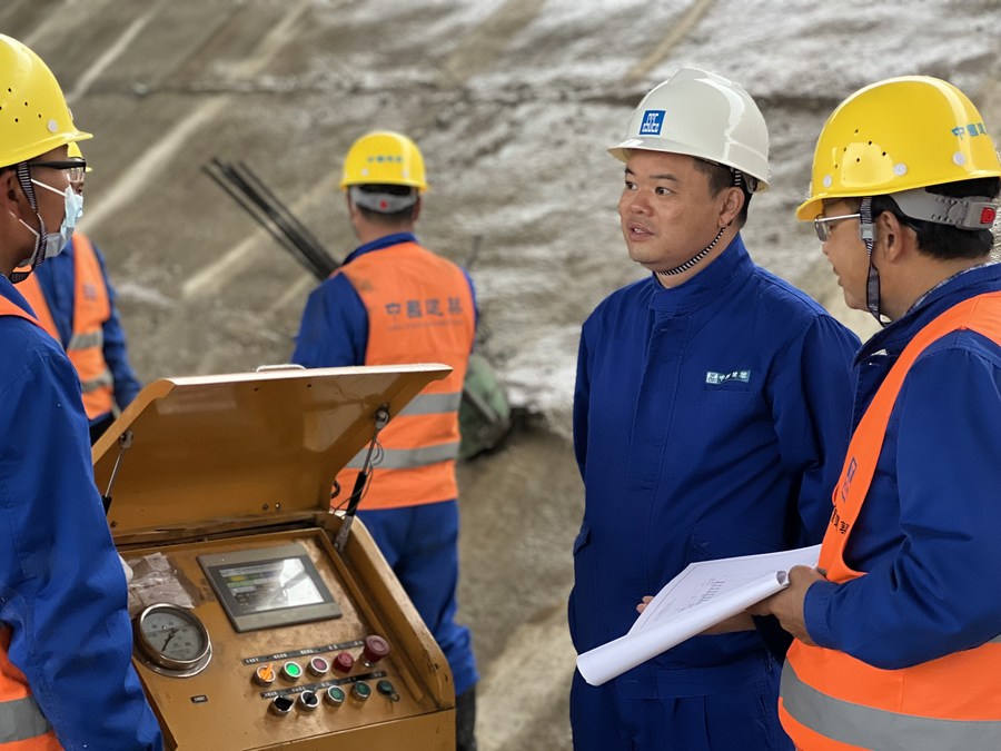في ولاية تيبازة بالجزائر، ليو رن (الثاني من اليمين) يتحدث مع زملائه حول مشروع طريق شرشال الدائري السريع، 28 أبريل 2022. (شينخوا)