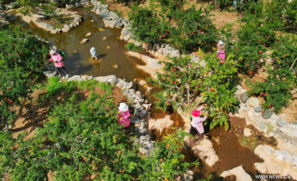 تساوتشوانغ 11 أكتوبر 2022 (شينخوا) في الصورة الملتقطة يوم 9 أكتوبر 2022، مشهد لقرويين يقطفون ثمار الرمان من بستان في بلدة ليويوان بحي ييتشنغ في مدينة تساوتشوانغ بمقاطعة شاندونغ شرقي الصين. وينشغل القرويون مؤخرا بحصاد الرمان وتجارته في ليويوان، وهي بلدة تشتهر بزراعة الرمان.