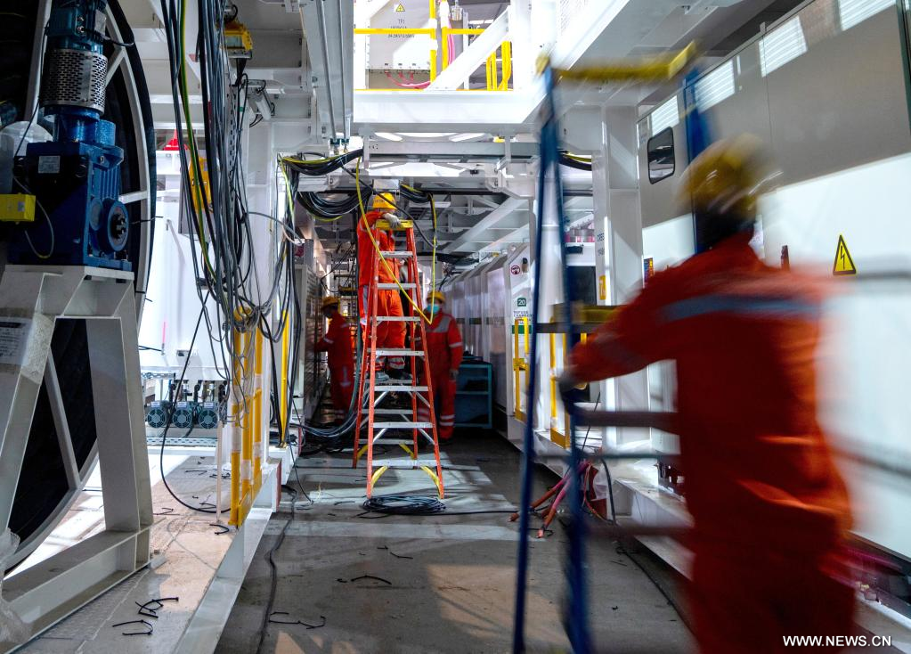 تشنغتشو 28 نوفمبر 2022 (شينخوا) في الصورة الملتقطة يوم 23 نوفمبر 2022، موظفون ينقلون مكونات آلة حفر الأنفاق في ورشة عمل لشركة مجموعة المعدات الهندسية بالسكك الحديدية الصينية في تشنغتشو حاضرة مقاطعة خنان بوسط الصين. وقد تم تصدير آلات حفر الأنفاق التي تصنعها الشركة إلى أكثر من 30 دولة ومنطقة، والتي تخدم بنشاط مشاريع بناء الأنفاق على مستوى العالم.