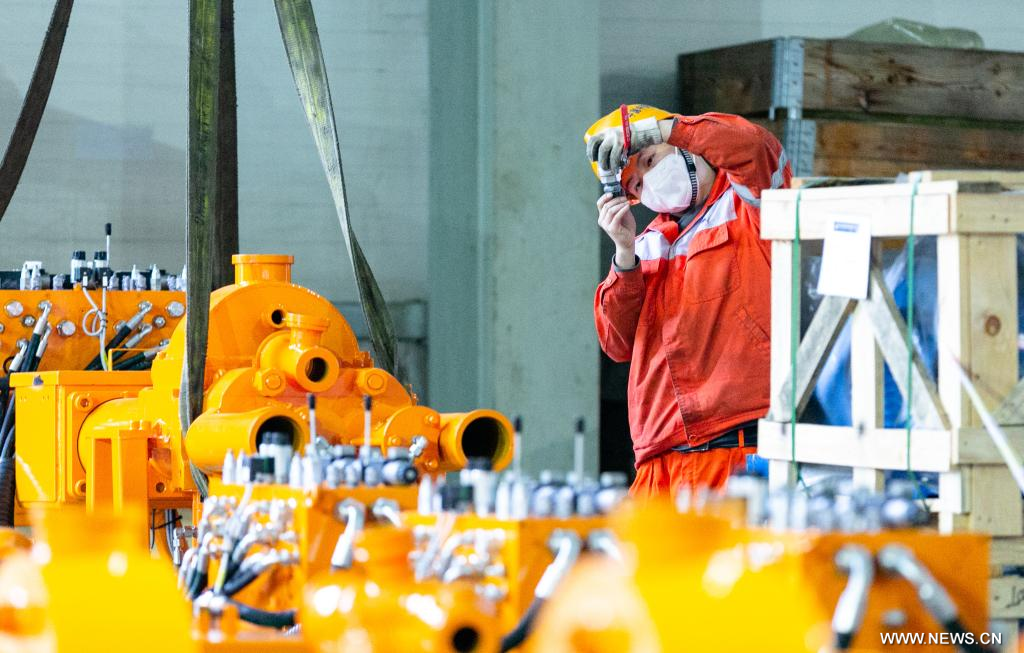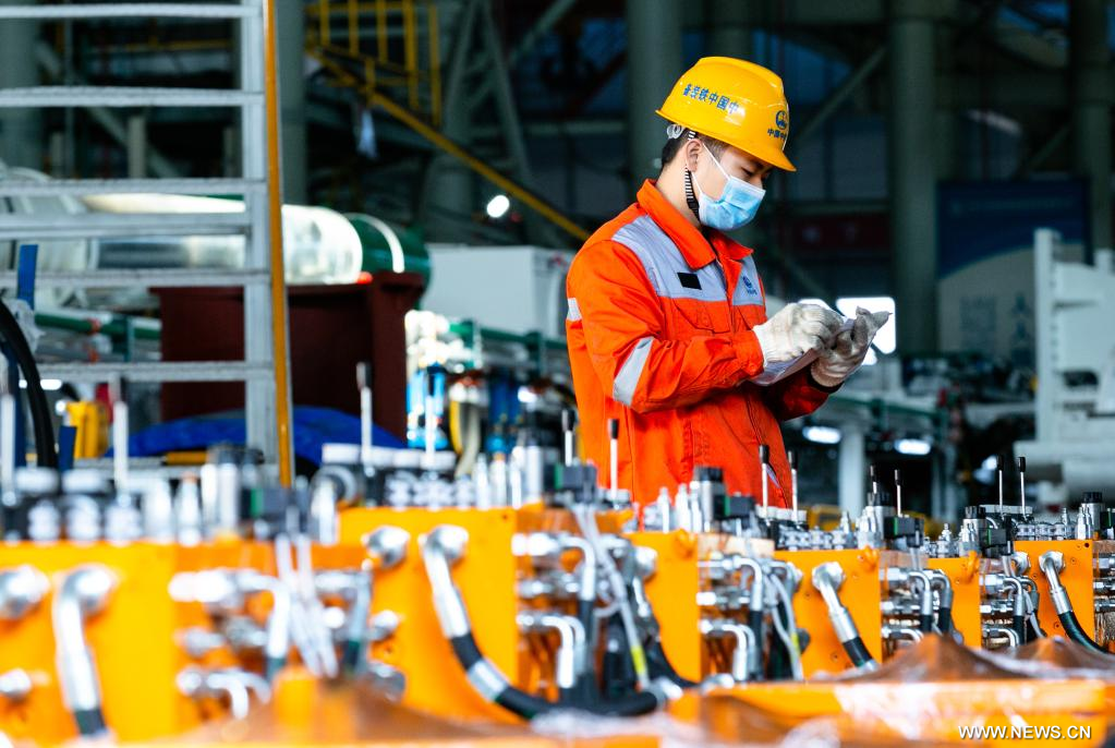 تشنغتشو 28 نوفمبر 2022 (شينخوا) في الصورة الملتقطة يوم 24 نوفمبر 2022، موظف يعمل في ورشة عمل لشركة مجموعة المعدات الهندسية بالسكك الحديدية الصينية في تشنغتشو حاضرة مقاطعة خنان بوسط الصين. وقد تم تصدير آلات حفر الأنفاق التي تصنعها الشركة إلى أكثر من 30 دولة ومنطقة، والتي تخدم بنشاط مشاريع بناء الأنفاق على مستوى العالم.