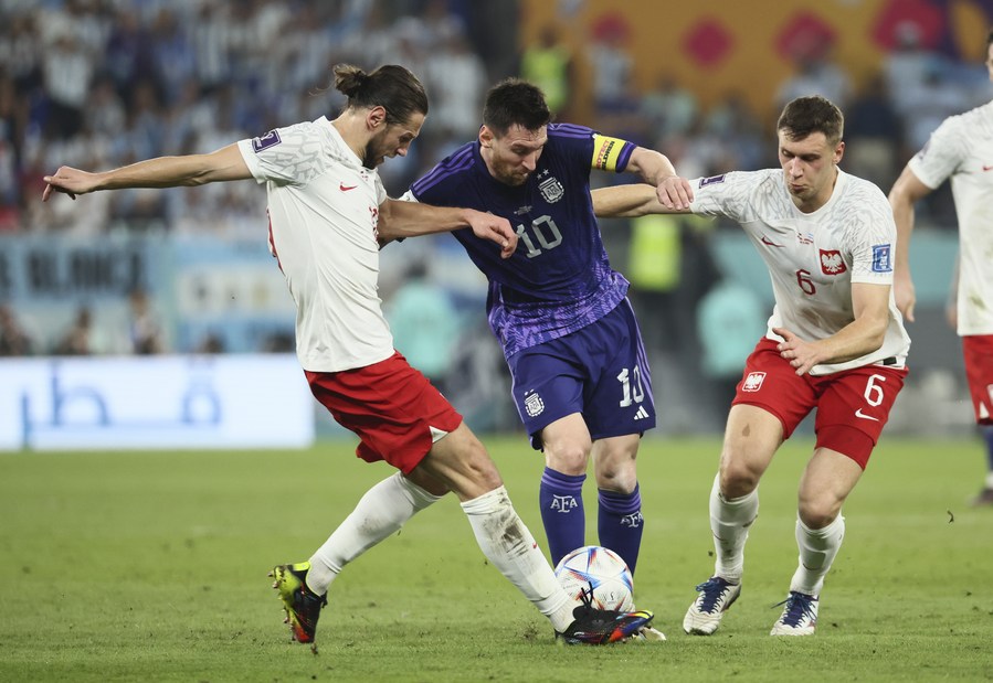 في الصورة الملتقطة يوم 30 نوفمبر 2022، الأرجنتيني ليونيل ميسي (وسط الصورة) في صراع على الكرة مع كريستيان بيليك (يمين الصورة) وغجيغوش كريخوياك من بولندا، خلال مباراة بولندا والأرجنتين ضمن المجموعة الثالثة في كأس العالم لكرة القدم قطر 2022. (شينخوا)