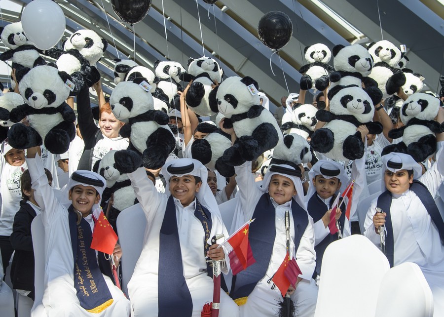 في الصورة الملتقطة يوم 19 أكتوبر 2022، أطفال يستقبلون زوج الباندا الصيني العملاق "سهيل وثريا" في الدوحة القطرية. وفي اليوم نفسه، وصل زوج الباندا الصيني العملاق "سهيل وثريا" إلى الدوحة، في أول رحلة للباندا إلى منطقة الشرق الأوسط.