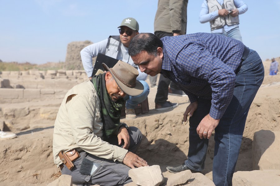 في الصورة الملتقطة يوم 12 يناير 2020، جيا شياو بينغ (اليسار في المقدمة)، رئيس الفريق الأثري الصيني، وآثاريون آخرون من البعثة الأثرية المصرية-الصينية المشتركة، يمارسون عملهم بمعبد مونتو بمدينة الأقصر، جنوبي مصر. وتم إنجاز المزيد من أعمال الحفائر والتوثيق الأثرية خلال الموسم الثاني من البعثة الأثرية المصرية-الصينية بمعبد مونتو ضمن مجمع معابد الكرنك، بمدينة الأقصر المصرية الغنية بالآثار.