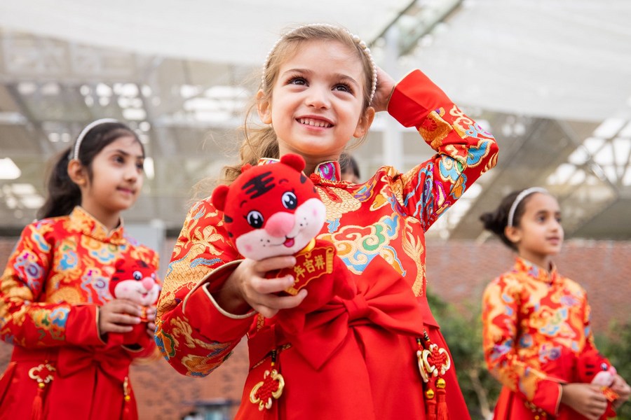 في الصورة الملتقطة يوم 31 يناير 2022، أطفال يرحبون بزوار جناح الصين في إكسبو 2020 دبي الذي أقيم في دبي، الإمارات العربية المتحدة.