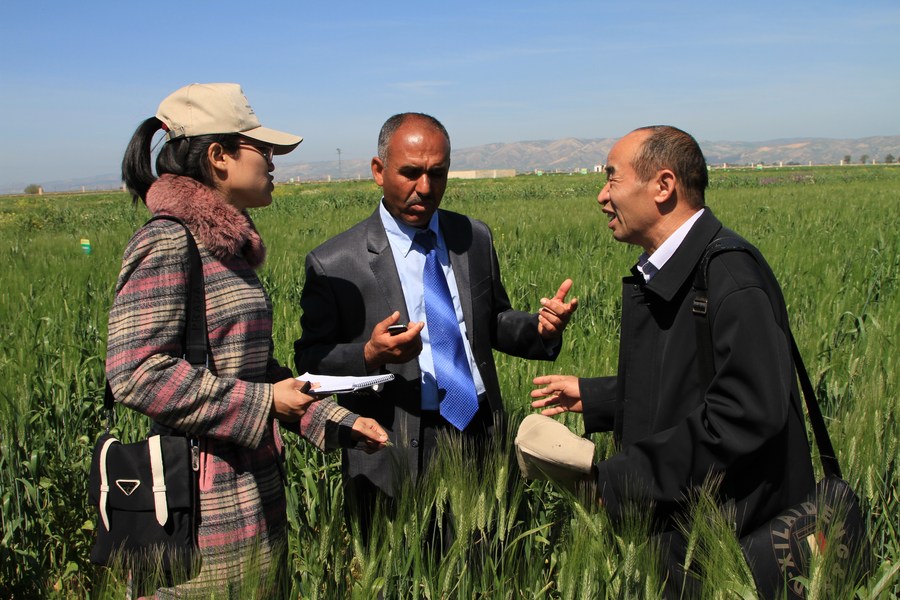 في الصورة الملتقطة يوم 24 مارس 2014، خبراء زراعيون من الصين والجزائر يعاينون المحاصيل الزراعية ويتبادلون الخبرات بشأن معالجة الأراضي المالحة والقلوية في حقل بولاية غليزان الجزائرية.