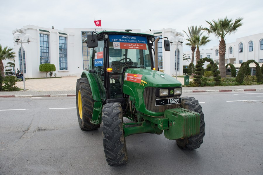 في الصورة الملتقطة أول أبريل 2019، جرار زراعي مزود بمعدات القيادة الذاتية المستندة على نظام "بيدو" للملاحة عبر الأقمار الصناعية يعرض القيادة الذاتية أثناء الدورة الثانية من منتدى التعاون الصيني-العربي لنظام "بيدو" في تونس.