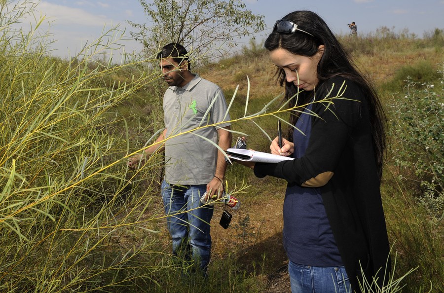 في الصورة الملتقطة يوم 2 سبتمبر 2013، اثنان من المشاركين في "البرنامج التدريبي حول تكنولوجيا مكافحة التصحر للدول العربية" وهما يسجلان حالة نمو نبات ساليكس شيلوفيلا عند حافة صحراء ماوووسو بمحافظة يانتشي في مدينة ووتشونغ بمنطقة نينغشيا ذاتية الحكم لقومية هوي في شمال غربي الصين. وانطلق البرنامج في مدينة ينتشوان بمنطقة نينغشيا في سبتمبر عام 2013، حيث تلقى 16 مشاركا تدريباً لمدة شهر على تكنولوجيا مكافحة التصحر.