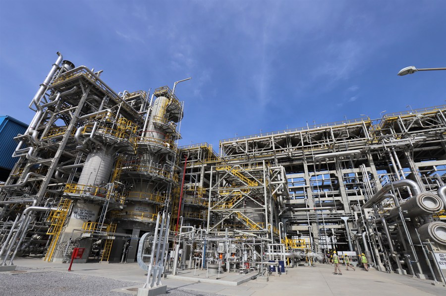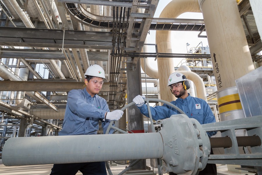 في الصورة الملتقطة يوم 2 يوليو 2018، عامل صيني وعامل سعودي يعملان في مصفاة ينبع أرامكو سينوبك للتكرير (ياسرف)، الواقعة على ساحل البحر الأحمر غربي المملكة العربية السعودية، والتي أنشأتها شركة سينوبك الصينية وشركة أرامكو السعودية بشكل مشترك.